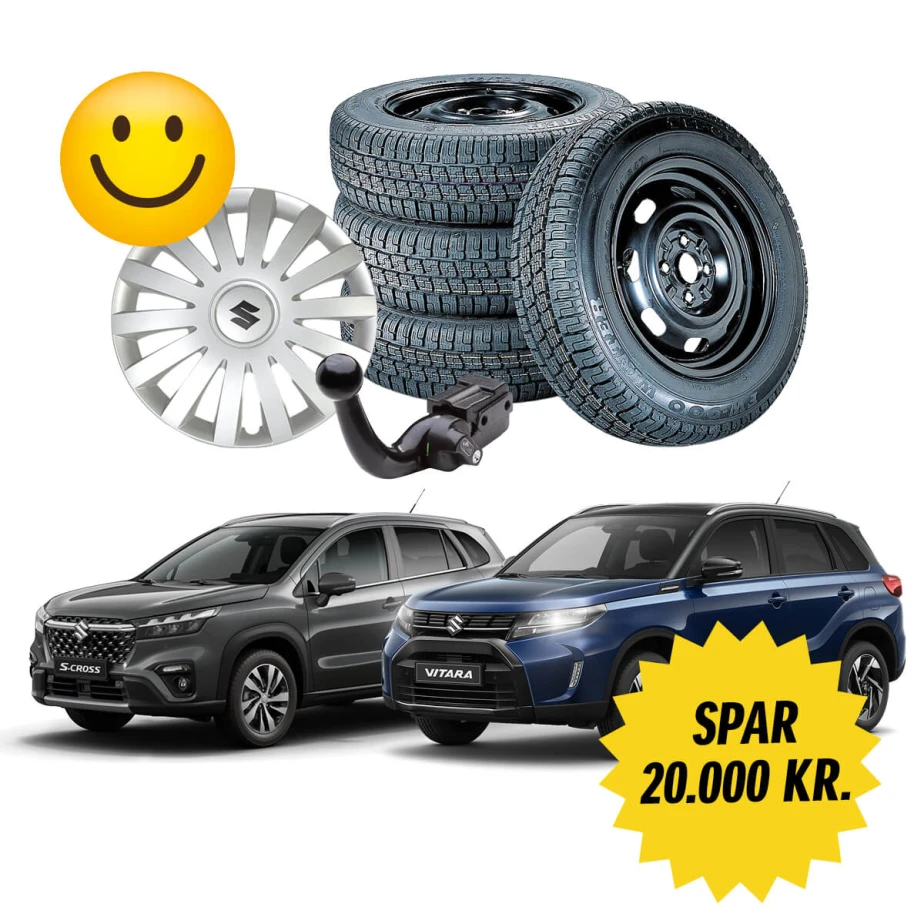 Lige nu kan du spare 20.000 på en ny Vitara eller S-Cross og aftageligt træk, vinterhjul og hjulkapsler. Begge de ikoniske SUV’er giver dig køreglæde, rigelig plads, masser af udstyr og god brændstoføkonomi. Kort sagt, alle ingredienserne til ægte ejerglæde.
